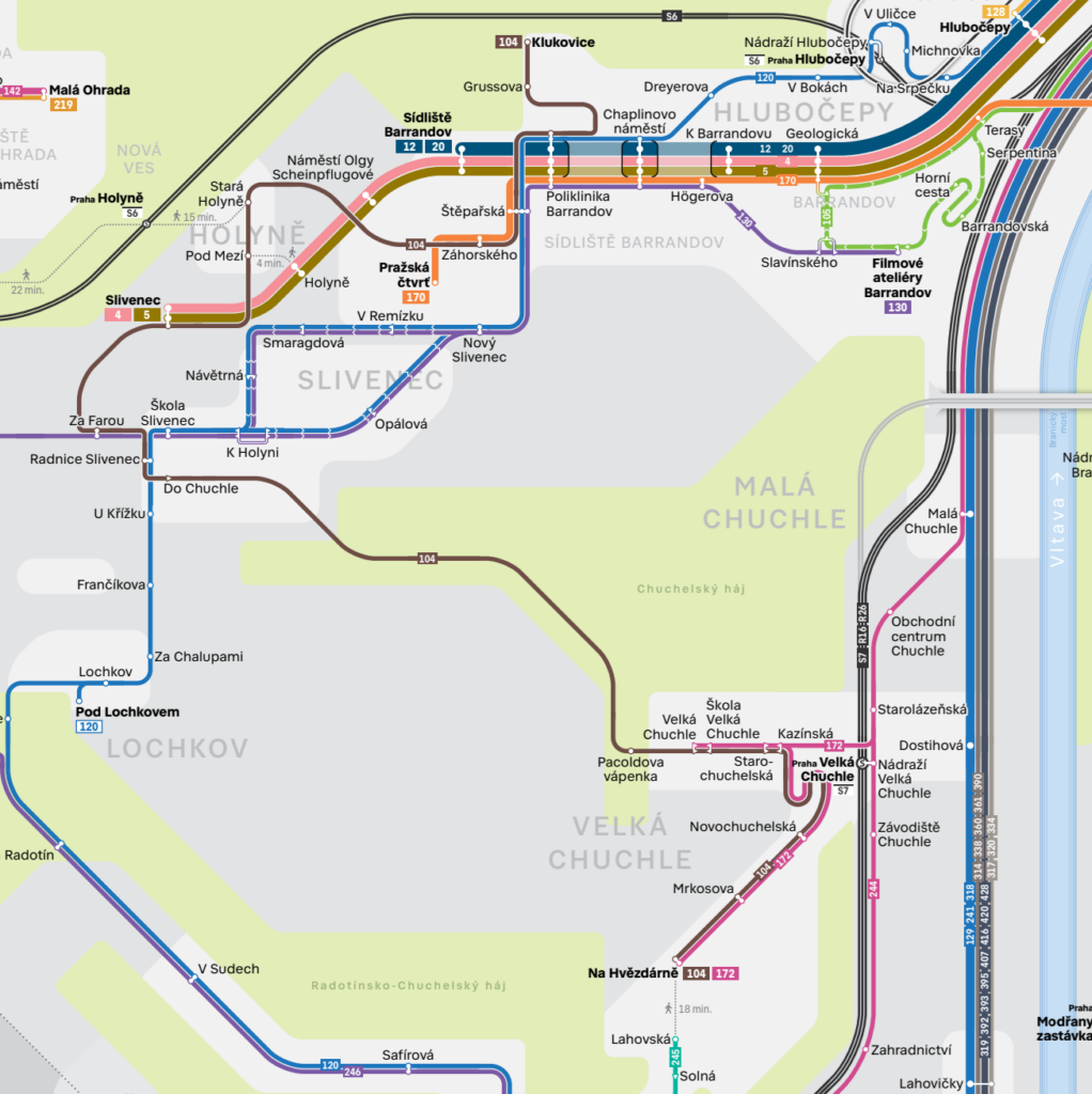 Schémata linkového vedení MHD v Praze, ve kterých je vyznačena také linka PID 104, jsou k dispozici na oficiálních stránkách PID: