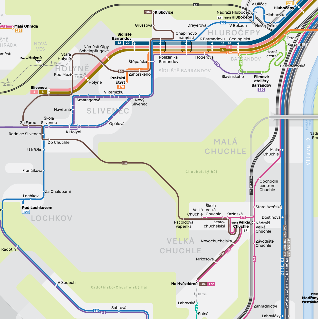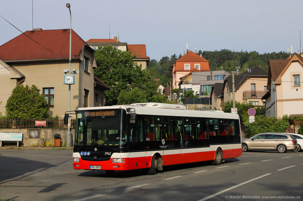 KLUKOVICE – Grussova – Poliklinika Barrandov – Štěpařská – Záhorského – Stará Holyně – Pod Mezí – Slivenec – Za Farou – Radnice Slivenec – Do Chuchle – Pacoldova vápenka – Velká Chuchle – Škola Velká Chuchle – Starochuchelská – Kazínská – Novochuchelská – Mrkosova – NA HVĚZDÁRNĚ