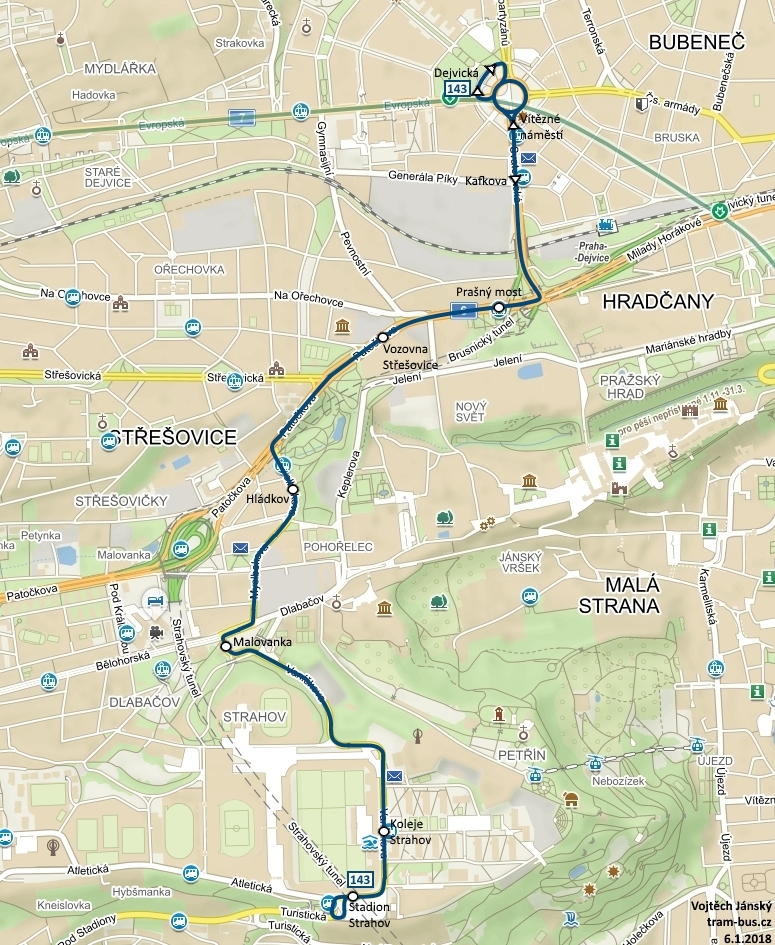 DEJVICKÁ (A) – Kafkova (T) – Vítězné náměstí (Z) – Prašný most – Vozovna Střešovice – Hládkov (x)- Malovanka – Koleje Strahov – STADION STRAHOV