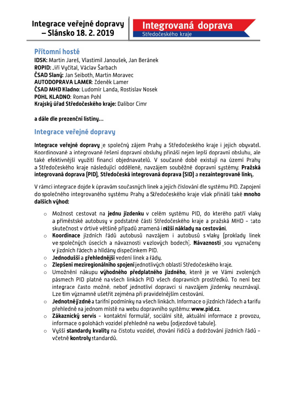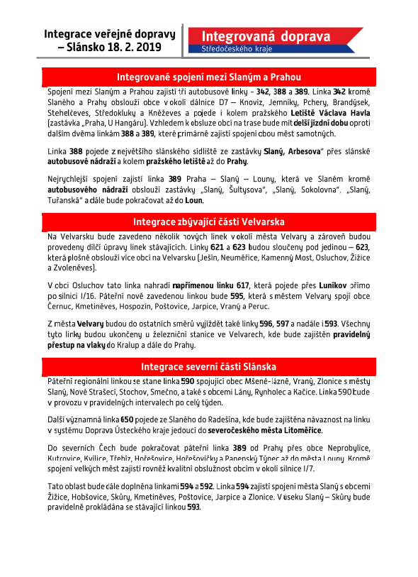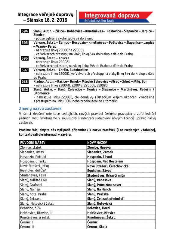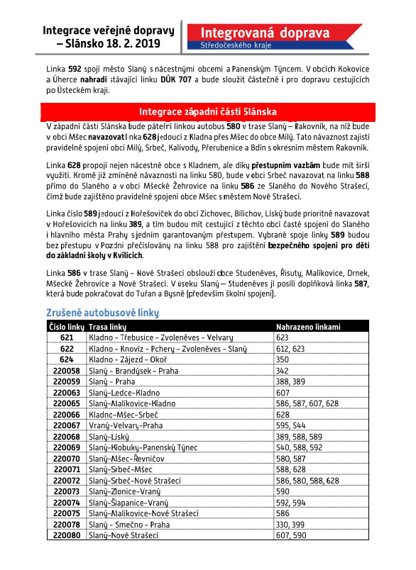 Od 27. července 24. srpna 2019 by mělo dojít k integraci Slánska do Pražské integrované dopravy. Organizátor dopravy již zaslal obcím první návrh jízdních řádů a upravenou mapku navrženého linkového vedení. Oba materiály naleznete níže.