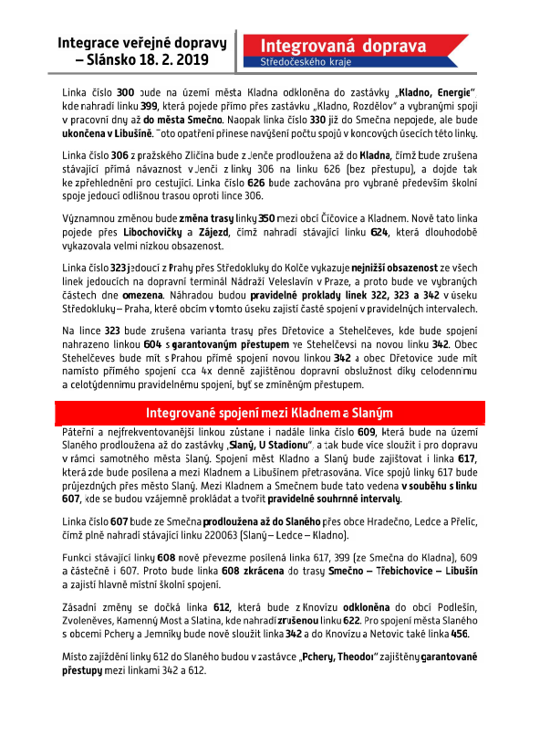 Linka 350 změní trasu mezi Velkými Číčovicemi a Kladnem. Již nepojede přímo na Buštěhrad, ale po trase linky 624, která bude zrušena. Spoje na lince 624 mezi Buštěhradem a centrem Kladna, resp. mezi Dřetovicemi a centrem Kladno, budou přesunuty na linku 604. Nově bude zajištěno také spojení mezi Okořem a Kladnem o víkendu – 3 páry spojů od 8 do 16 hodin.