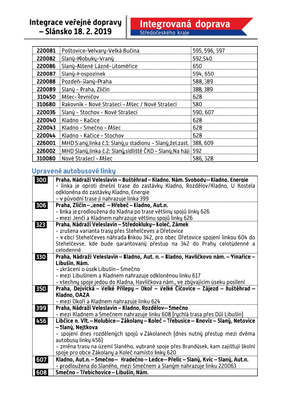 | 456 | Libčice n. Vlt. – Holubice – Zákolany – Koleč – Třebusice – Knovíz – Slaný, Netovice – Slaný, Poliklinika – spojení dnes rozdělených spojů v Zákolanech (dnes nutný přestup mezi dvěma autobusy linky 456) – změna trasy na území Slaného, vybrané spoje přes Brandýsek, kam zajišťují školní spoje pro obce Zákolany a Koleč namísto linky 620 |