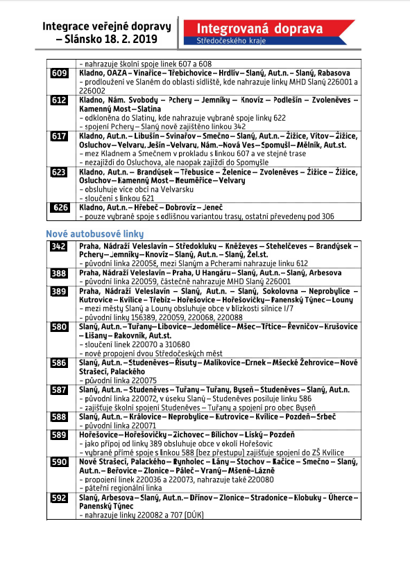 Zásadní změny se dočká linka 612, která bude z Knovízu odkloněna do obcí Podlešín, Zvoleněves, Kamenný Most a Slatina, kde nahradí zrušenou linku 622. Pro spojení města Slaného s obcemi Pchery a Jemníky bude nově sloužit linka 342 a do Knovízu a Netovic také linka 456.