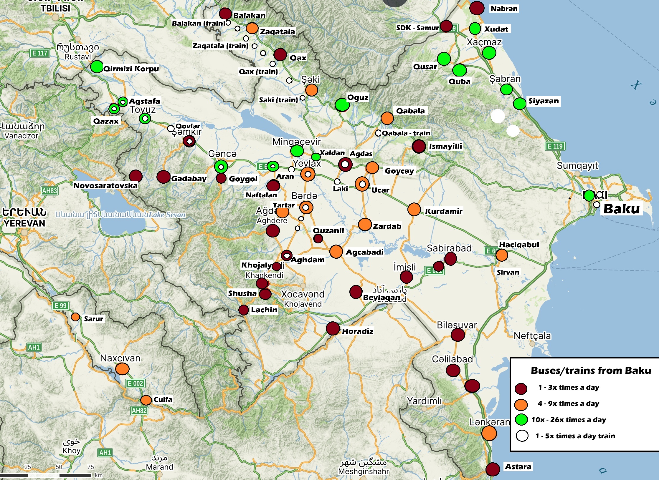 - Baku – Xocali – Xankandi – Susa – Lacin, 2 spoje, jízdní doba 7 h (do Xankendi 5,5 h)